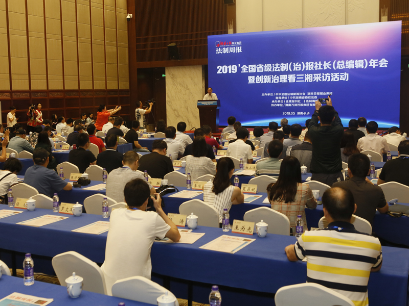 5月的湖南清新潤(rùn)澤。27日上午,2019’全國省級(jí)法制(治)報(bào)社長(zhǎng)(總編輯)年會(huì)在長(zhǎng)沙市召開,啟動(dòng)創(chuàng)新治理看三湘采訪活動(dòng)。來自全國29家省級(jí)法制(治)報(bào)的社長(zhǎng)、總編輯及優(yōu)秀記者匯聚湖南,聚焦創(chuàng)新社會(huì)治理,共商法制媒體融合發(fā)展。