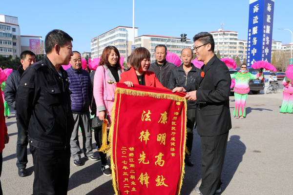 3月21日,阜新市海州區(qū)人民法院的大門口喧天鑼鼓伴隨著秧歌隊歡快的舞步,吸引了往來的車輛慢行和行人的駐足。該市某小區(qū)240戶業(yè)主的9名代表向執(zhí)勤法警說明,他們是來感謝海州區(qū)法院民事審判一庭的法官成健的,其中小區(qū)業(yè)委會副主任手里拿著一面上書“‘廉明高效 法律先鋒’贈海州區(qū)法院民一庭成健法官”的錦旗。