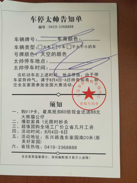 本報(bào)訊 “商家用這種方式做宣傳,真讓人不舒服。”遼陽(yáng)一市民發(fā)現(xiàn)停在路邊的愛(ài)車上貼了一張“違停單”,走近一看,竟是某商場(chǎng)的廣告宣傳單。宣傳單以山寨“違停單”的形式,宣傳該商場(chǎng)的活動(dòng)。對(duì)于商家的此種行為,不少市民表示有些“雷人”。